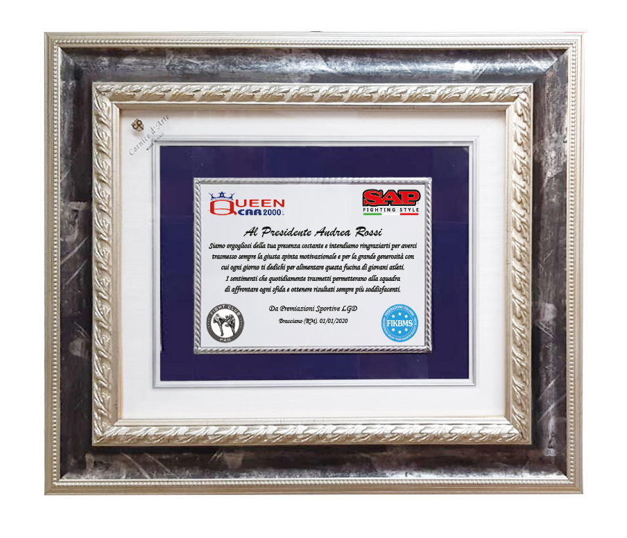 La targa e' in alluminio sublimatico e puo' essere di tre tipi : Argento, Oro o Bianco.